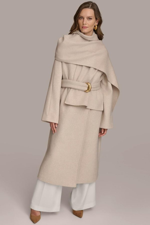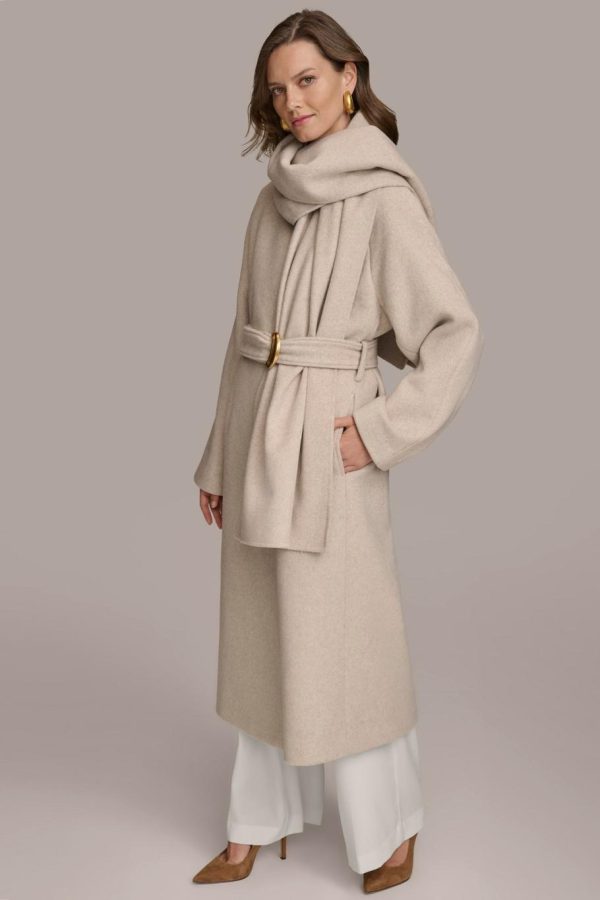 A classic cold-weather silhouette with a twist. Crafted in a cozy wool-blend, this coat features a self-tie belt at the waist, oversized lapels and a detachable scarf for added warmth.