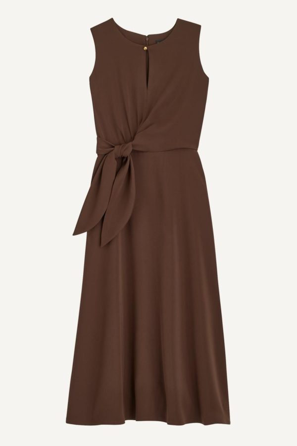 A refined, timeless look suitable for the office, formal occasions, and beyond. This midi dress boasts a round neck and a tie at the side.