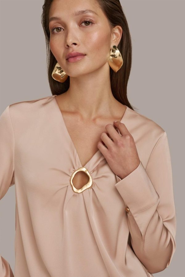 This silky, elegant blouse is made modern with a hardware keyhole detail and gathering at the front. Pair it with your favorite sleek trousers and heels for a chic going-out look.